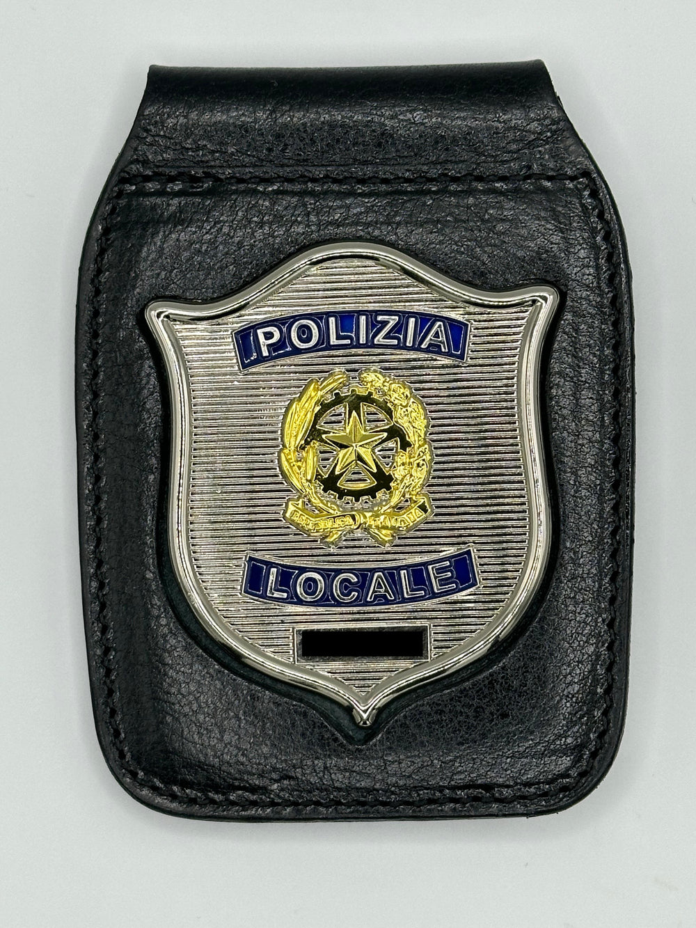 Porta placca Polizia Locale Ascot da cintura e da collo, realizzato in Italia in pregiata vera pelle.Permette di appendere il distintivo alla cintura o a collo. Distintivo Polizia Locale, da applicare con linguetta a molla (rimovibile) e dotato di numero seriale registrato. Porta distintivo di ottima qualità, realizzato in Italia con vera pelle che gli conferisce un'ottima resa estetica ed una grande resistenza all'uso.
