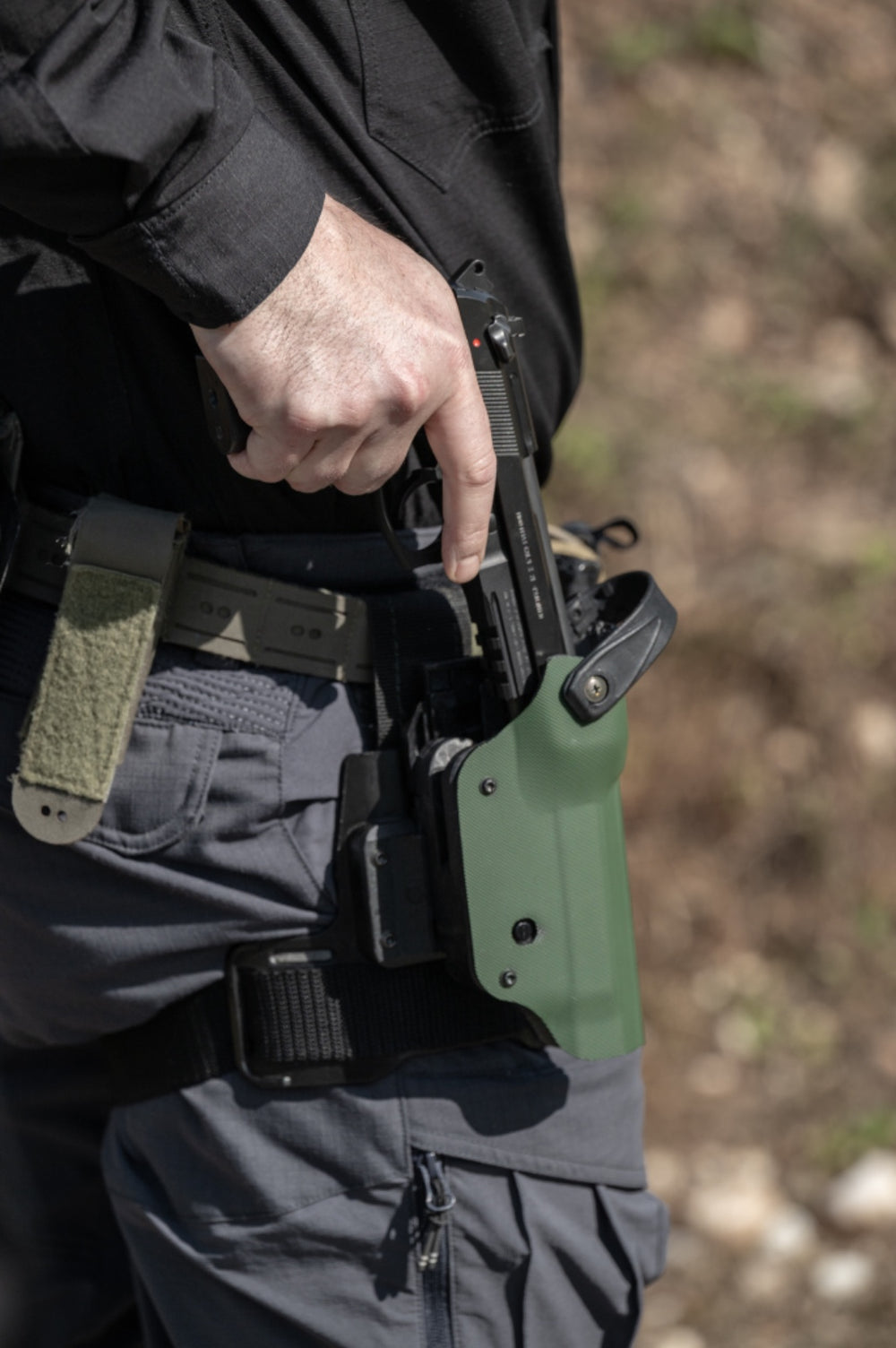 L’ergonomia è uno degli aspetti distintivi: il corpo rigido avvolge perfettamente la pistola Beretta, mantenendola stabile durante il movimento, ma pronta all’uso grazie a un’estrazione rapida e fluida.