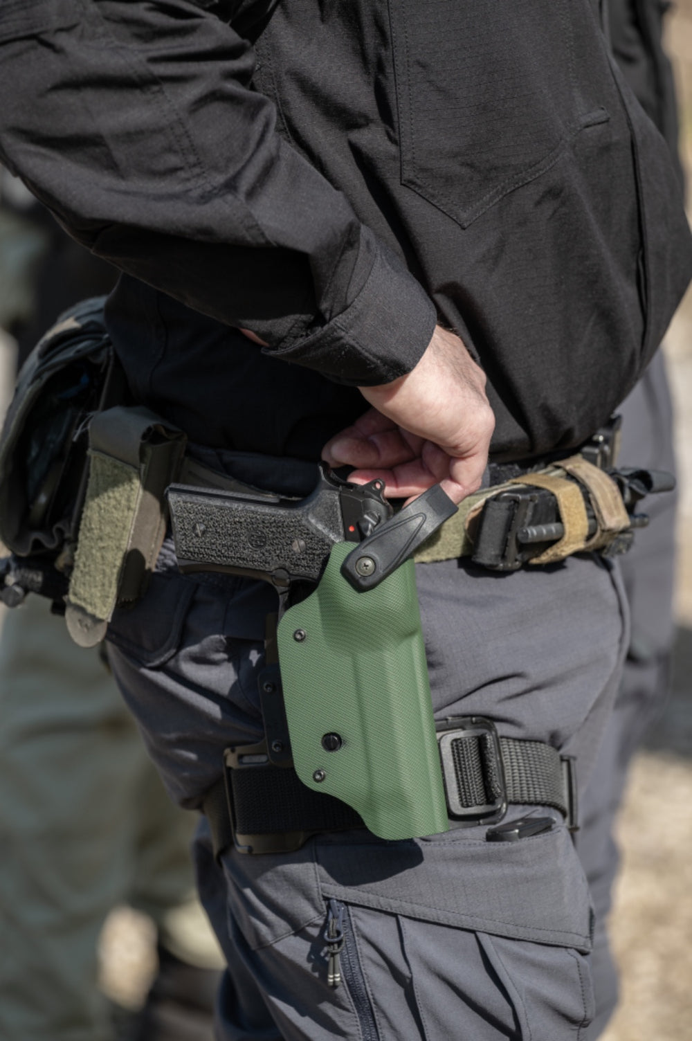 L’integrazione con cinture operative e basette modulari è semplice e rapida, rendendo questa fondina altamente versatile per differenti configurazioni tattiche.