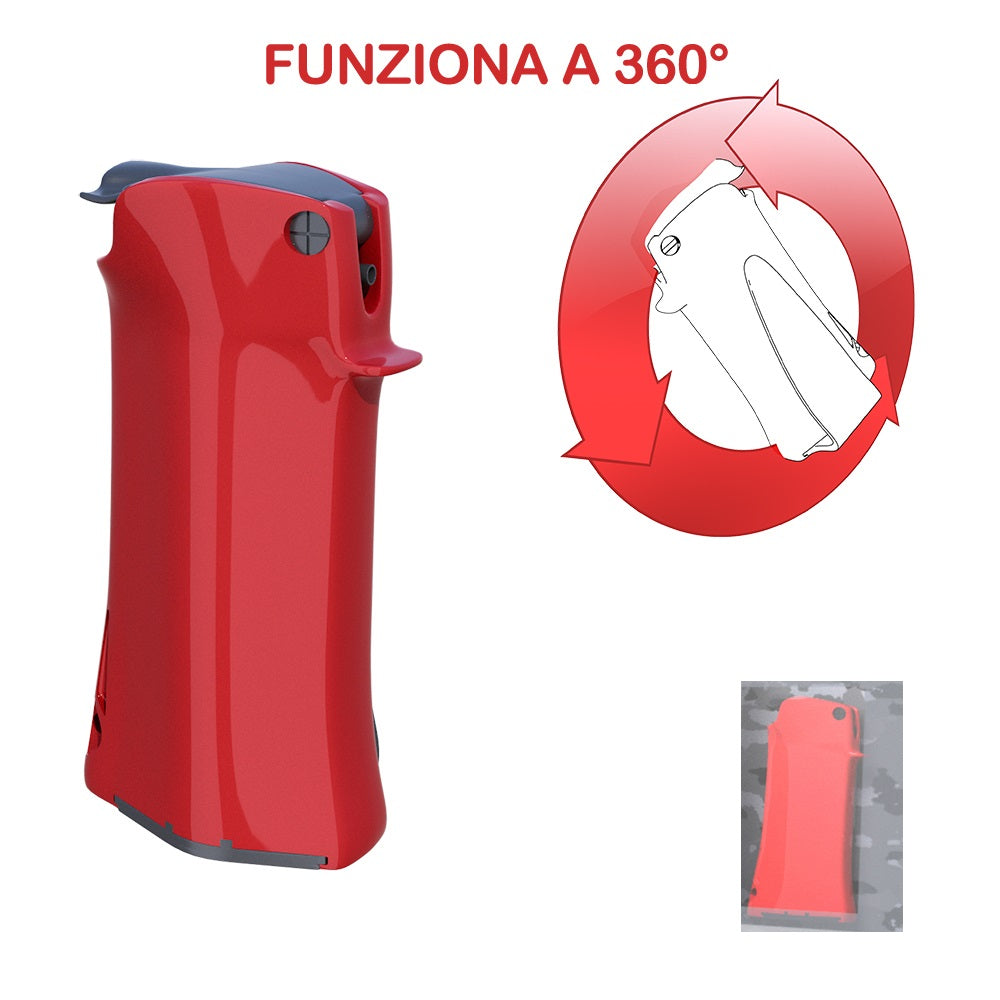 Grazie ad una ventennale esperienza e moltissimi test effettuati con la collaborazione di svariate polizie europee, abbiamo realizzato il primo spray che è in grado di funzionare con qualsiasi angolazione di utilizzo. Tutti i prodotti in concorrenza cominciano a perdere potenza già dai 15° e superati i 45° smettono di funzionare. Nel JUBILEUM 360 il liquido O.C. è contenuto all’interno di una sacca che lo tiene separato dal propellente, consentendo al dispositivo di mantenere la potenza del getto costante a qualsiasi angolazione.