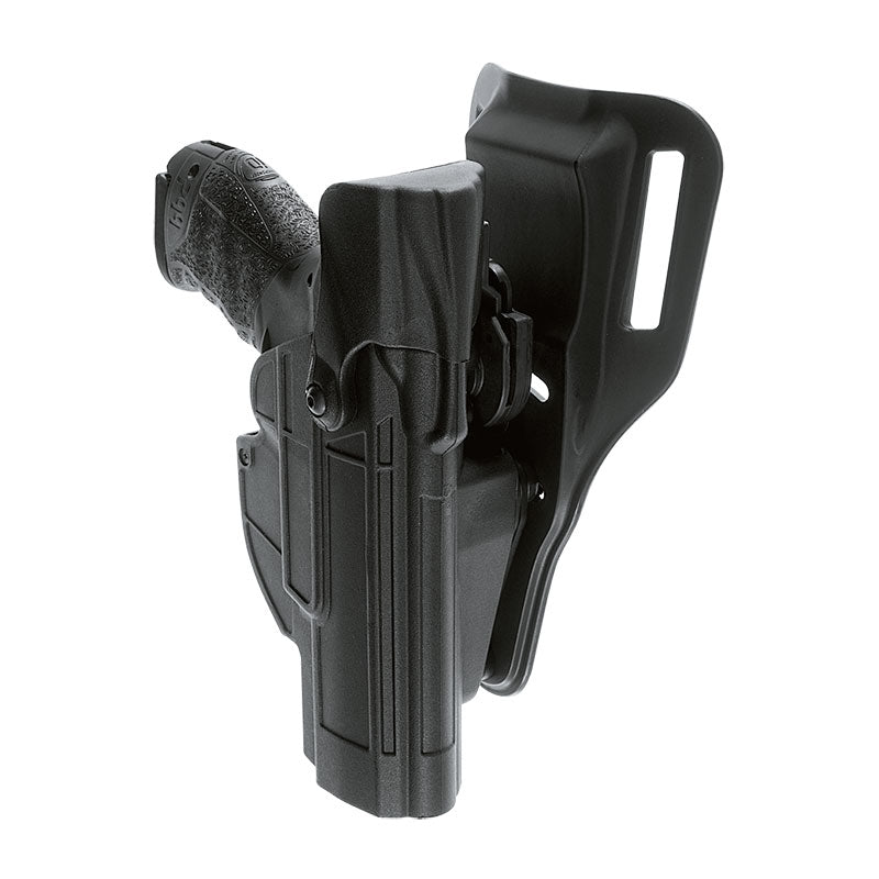 Il cuore della fondina è il meccanismo di bloccaggio attivo, che trattiene saldamente l’arma all’interno. L’operatore può sbloccare il sistema con un gesto naturale e rapido, mantenendo il controllo totale anche in situazioni concitate. Il Security System impedisce prelievi accidentali o da parte di terzi.