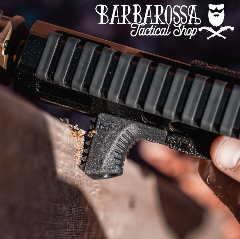 It is also slightly curved for optimized contact on uneven surfaces, giving you the ability to rotate the weapon while maintaining contact and control.