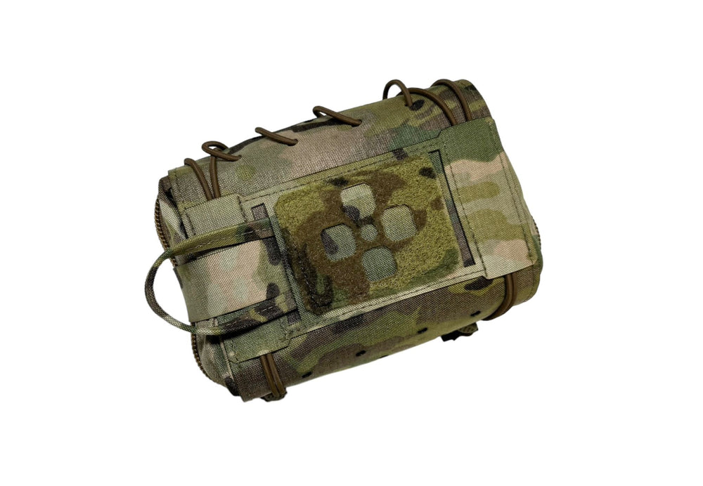 The interior is made up of two perforated panels in which it is possible to modulate the space using bunjee cord to make it suitable for the medical devices in possession, closing everything with a zip along its entire length to ensure containment, in addition to an external sleeve in the There are holes at the top and bottom to accommodate tourniquets, cyalumes or anything else that you need close at hand via an elastic cord.