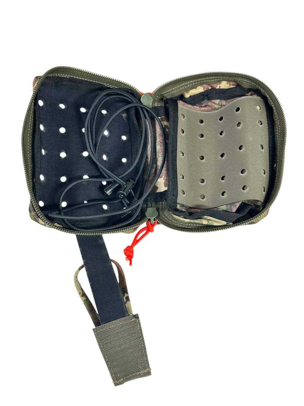 The interior is made up of two perforated panels in which it is possible to modulate the space using bunjee cord to make it suitable for the medical devices in possession, closing everything with a zip along its entire length to ensure containment, in addition to an external sleeve in the There are holes at the top and bottom to accommodate tourniquets, cyalumes or anything else that you need close at hand via an elastic cord.