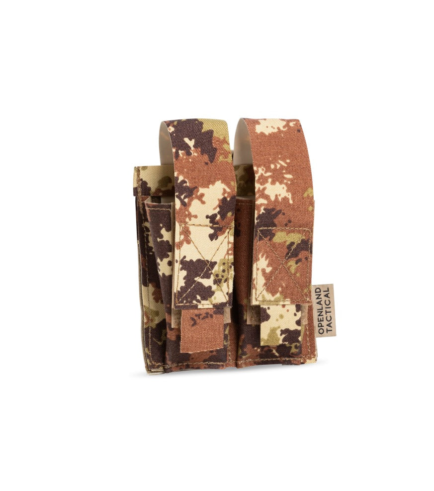 La mimetica Vegetato Italiano, in dotazione ufficiale alle forze armate italiane, rende questa doppia pouch perfetta per ambienti boschivi, collinari o con vegetazione fitta.