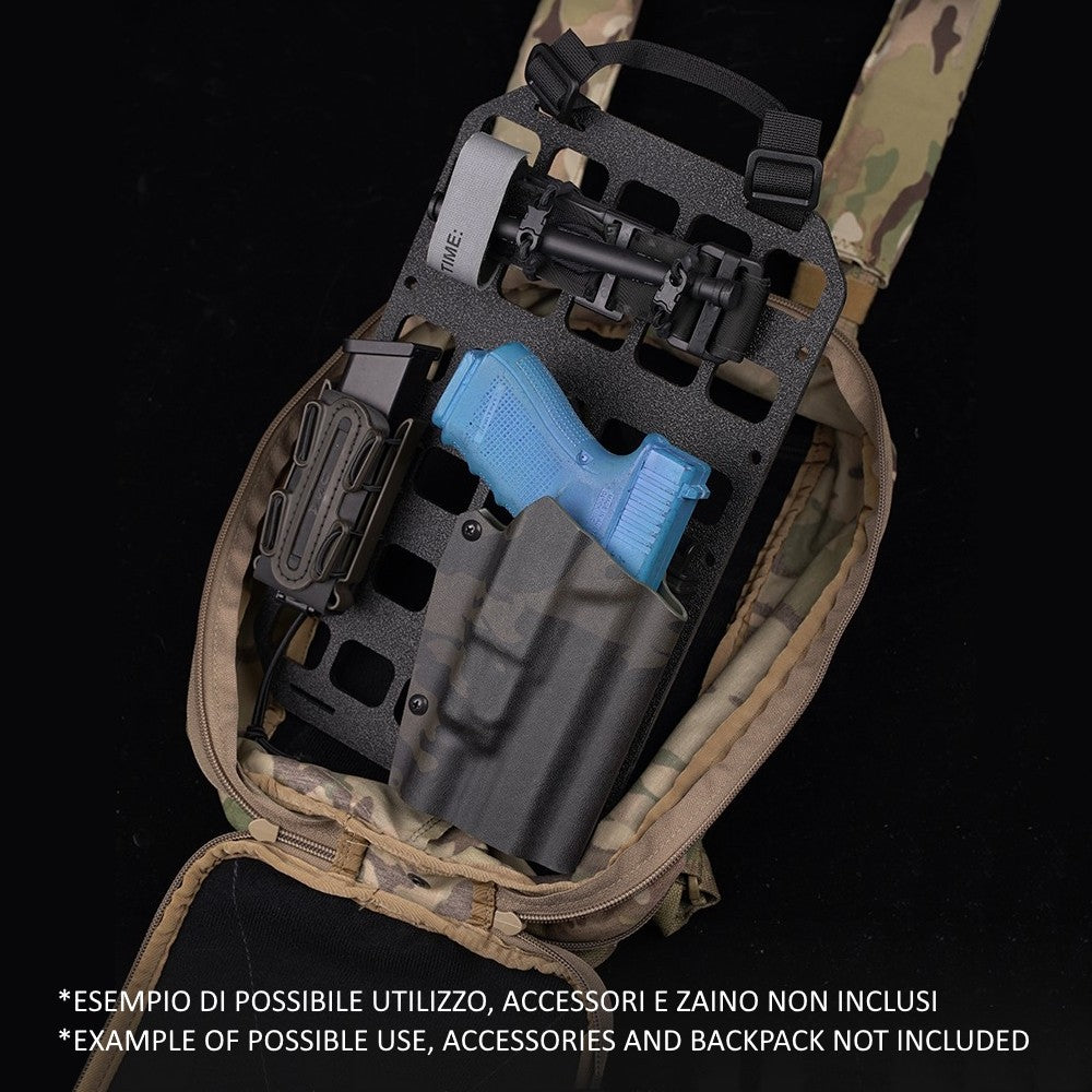 LA PIASTRA PUO' ESSERE FISSATA CON VITI AL MURO O ALL'INTERNO DI ZAINI O VALIGETTE PREDISPOSTI