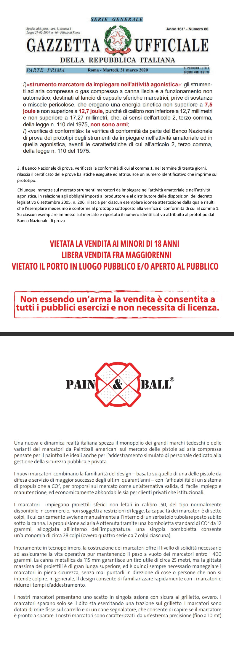 Questa pistola è conforme alle normative di sicurezza europee e viene fornita con tutte le certificazioni necessarie per un uso sicuro e controllato. È perfetta per l'uso in ambienti come poligoni di tiro, club di tiro sportivo, o per chi cerca una pistola non letale da usare per autodifesa in contesti sicuri.