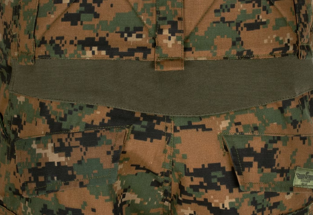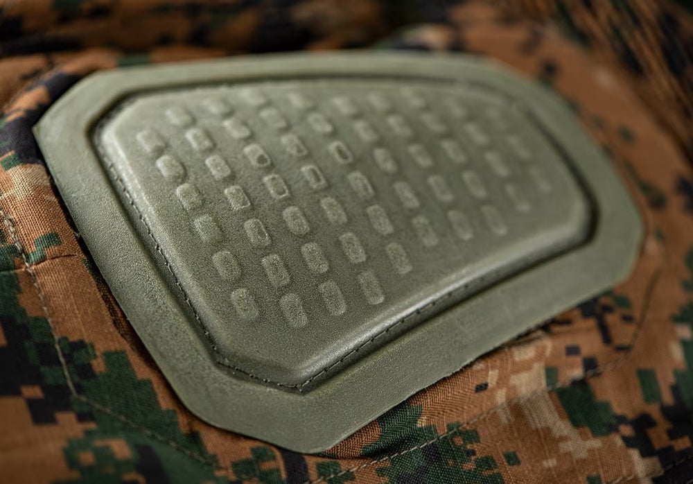 Under the belt area and around knees is located elastic fabric for comfort and high mobility. Extra level of protection is provide by included pads designed to protect the joints by efficiently distributing impact energy. Those can be tightly fitted to the user thanks to adjusting system on the inside of upper pockets and straps around the knees.