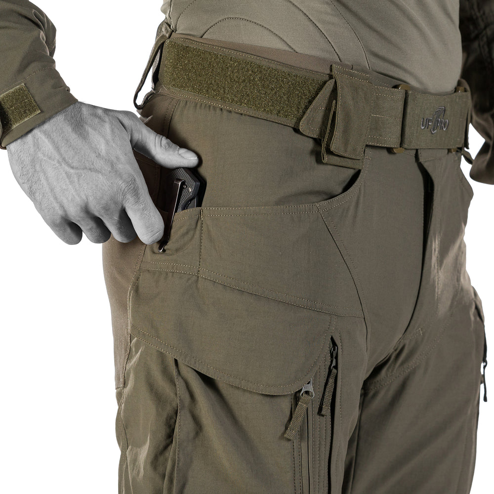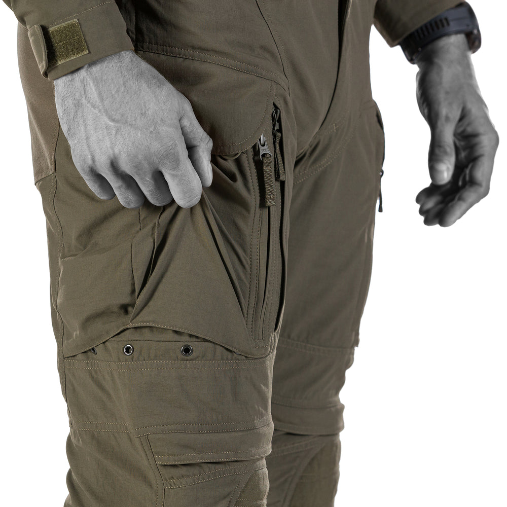 The side pockets are oversized to maximize the amount of essential gear you can carry. To prevent items from bouncing around inside as you run, jump, duck or dodge, we've equipped each side pocket with an internal bungee cord plus additional elastic. Additionally, the pockets have a sealable flap secured with Canadian rubber buttons. The side pockets also have a vertical zipper that makes it convenient to retrieve gear even while you're on your knees. And if you prefer Velcro pocket closures rather than buttons, the pants come with a kit that lets you swap them easily.