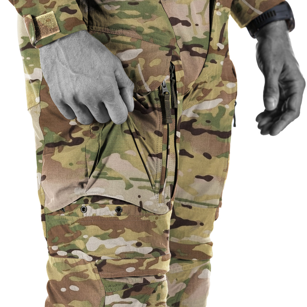 The side pockets are oversized to maximize the amount of essential gear you can carry. To prevent items from bouncing around inside as you run, jump, duck or dodge, we've equipped each side pocket with an internal bungee cord plus additional elastic. Additionally, the pockets have a sealable flap secured with Canadian rubber buttons. The side pockets also have a vertical zipper that makes it convenient to retrieve gear even while you're on your knees. And if you prefer Velcro pocket closures rather than buttons, the pants come with a kit that lets you swap them easily.