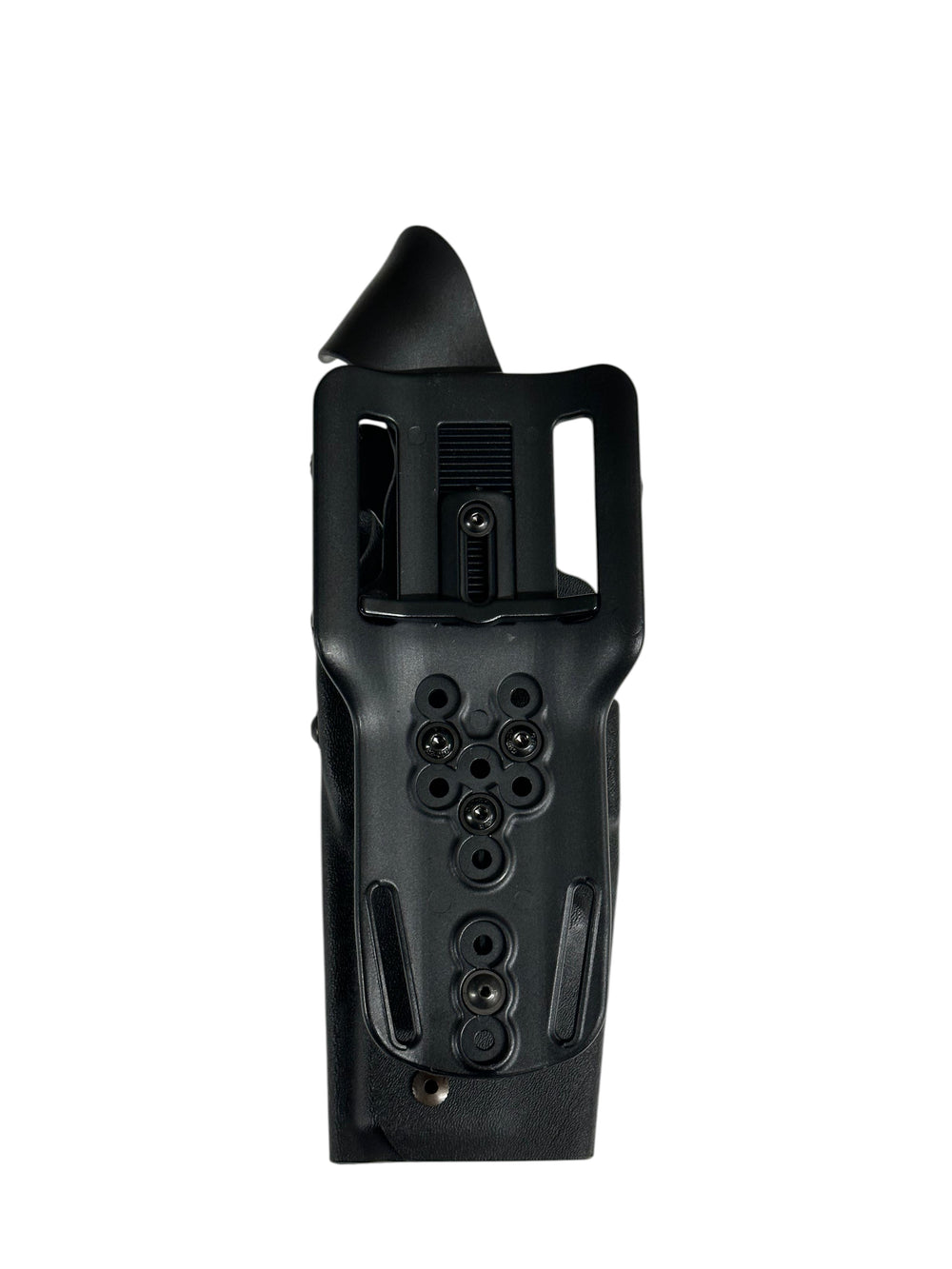 Una vite di ritenzione posizionata sotto il ponticello dell’arma permette di regolare la frizione tra la fondina e la pistola, adattando la resistenza di estrazione secondo le preferenze dell’operatore. Il passante integrato mantiene l’arma alla corretta distanza dal corpo e con l’impugnatura perfettamente allineata alla cintura, favorendo un’estrazione rapida e una postura naturale in qualsiasi situazione.