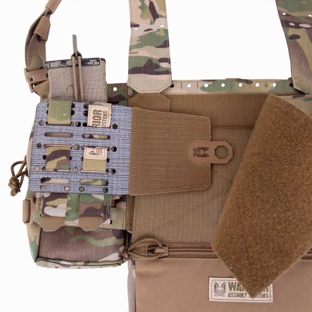 The Wing Velcro Universal Panel, attaches using Velcro under the front panel of the full range of Warrior plate carriers and chest rigs. The side cummerbund closes over the panel and pouch so that both are secured on the operator’s body side, streamlining the outer profile of the carrier and eliminating snag hazards.