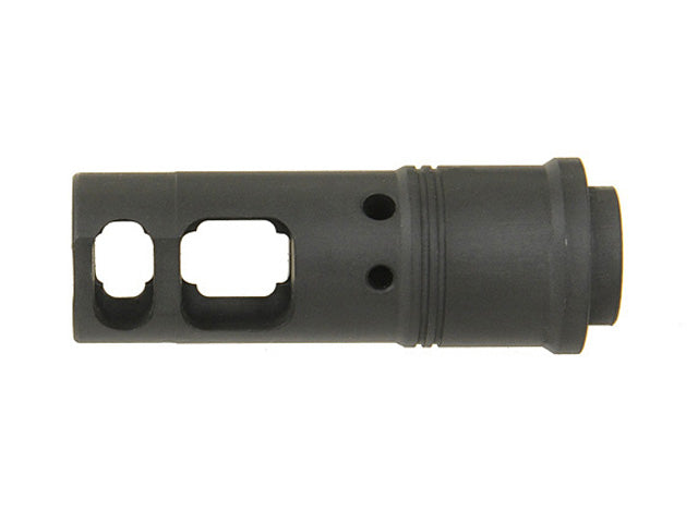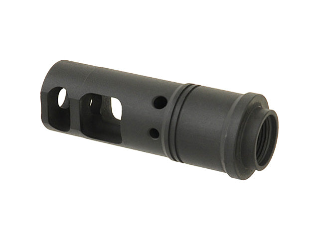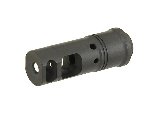 Questo finto spegnifiamma è costruito in lega metallica solida e rifinito con trattamento nero opaco, per un'estetica fedele ai modelli militari americani. La superficie è resistente a graffi e usura, perfetta per l’uso intensivo in campo.
