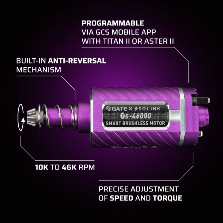 Il Gate G5 Smart Brushless Motor rappresenta una rivoluzione nel mondo del softair: il primo motore brushless programmabile via app, pensato per offrire controllo, prestazioni e affidabilità. Integrato perfettamente nell’ecosistema GATE (ASTER II/TITAN II Bluetooth), è ideale per chi cerca una replica AEG dalle prestazioni personalizzabili e professionali.