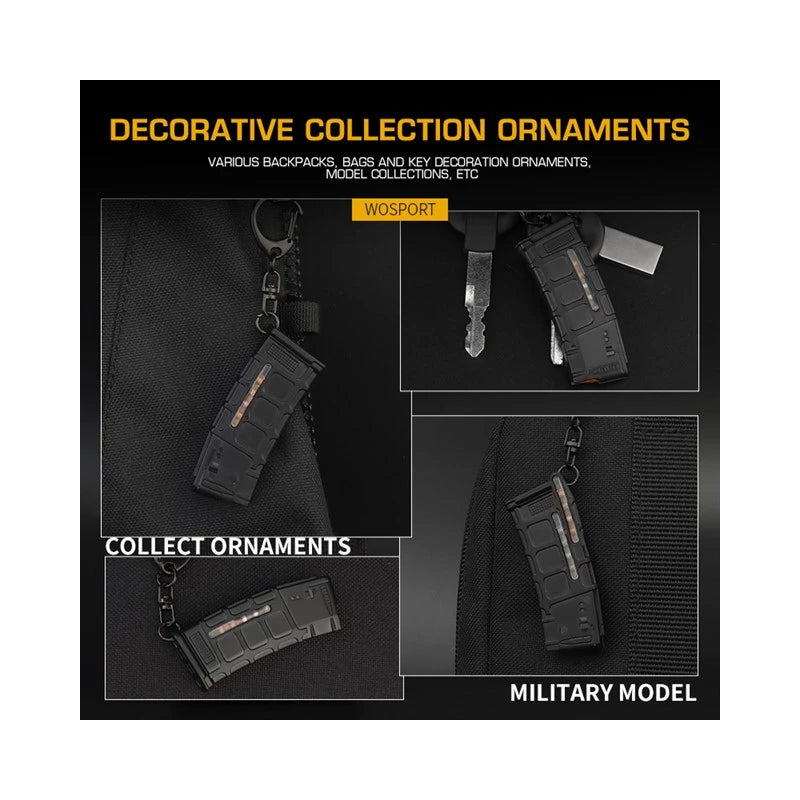 A stylish carabiner pendant in the shape of a magazine with lots of details. Suitable for keys or backpack.