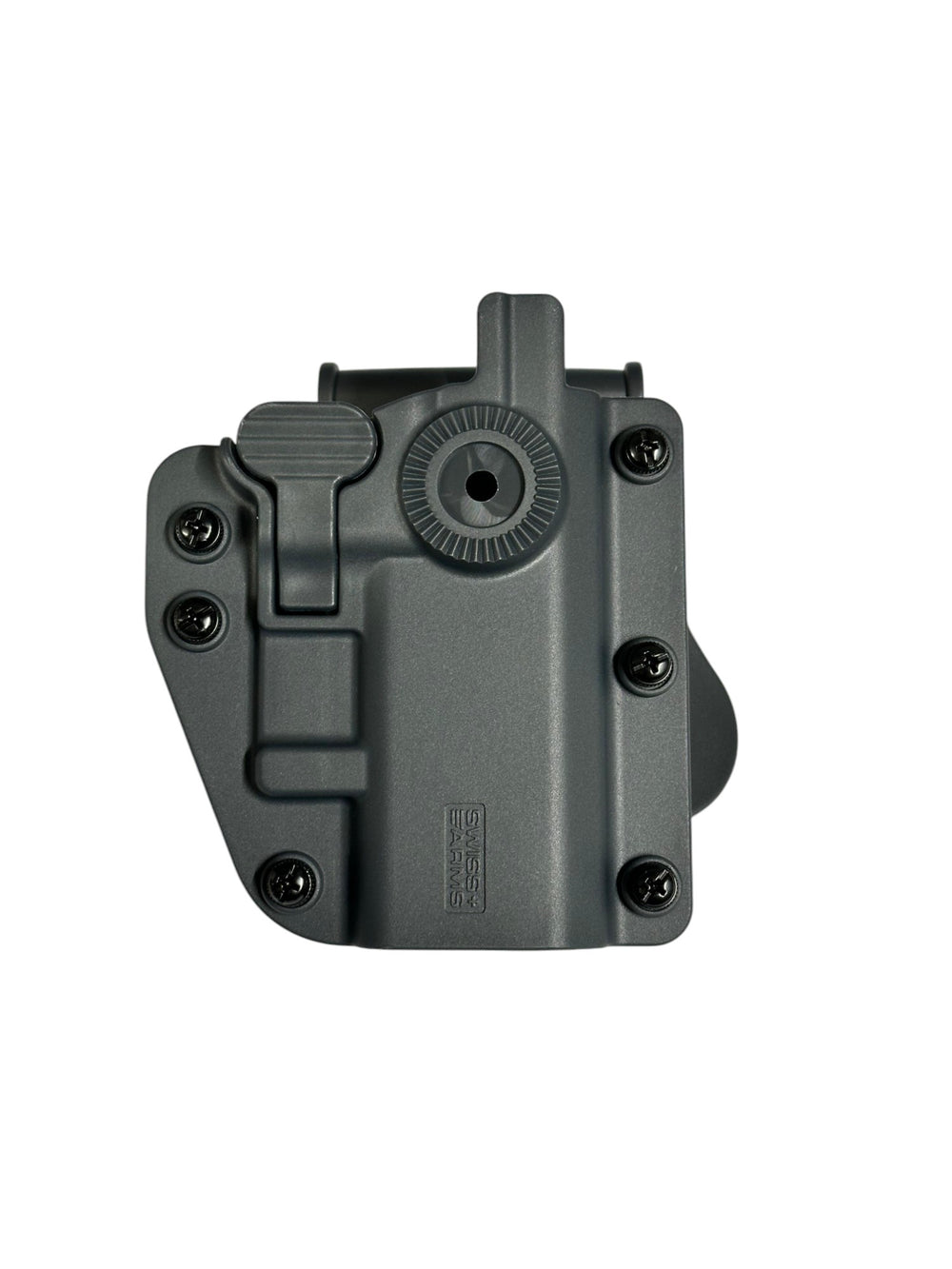 Botón de liberación reemplazable para transformar la funda de diestro a zurdo.