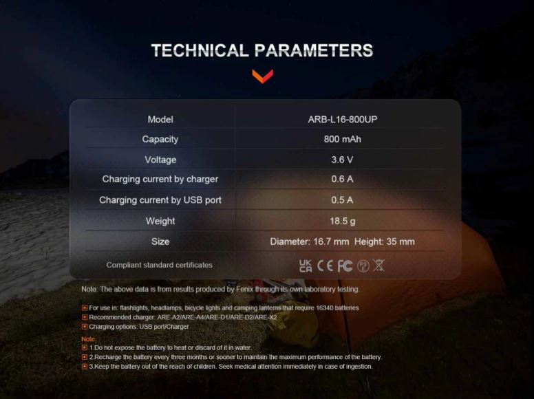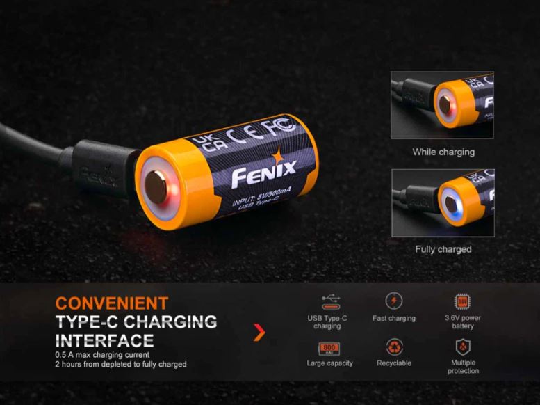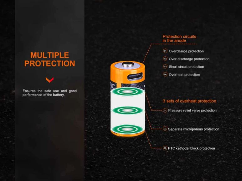 The Fenix ARB-L16-800UP Built-in USB-C Rechargeable Battery is a 16340 Li-ion battery with a protection circuit in the anode to help prevent short circuits, overcharge/discharge and overheating. This battery has its own USB Type-C charging port for quick/easy charging without the need for a separate charger. The battery also includes multiple levels of protection including overcharge protection, overheat protection, and pressure relief vents which expel waste gas in the rare case of an internal short circuit preventing an explosion.