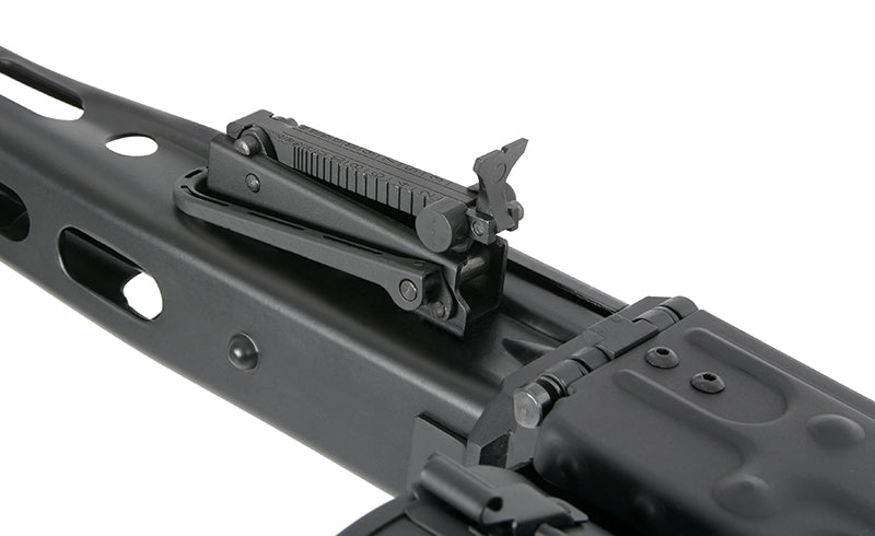 Realizzato quasi interamente in acciaio stampato, con calci e impugnature in legno autentico e puntali in metallo, questa replica offre un mix di robustezza e storicità. Il bipiede pieghevole in acciaio e le maniglie di trasporto accentuano l’autenticità .