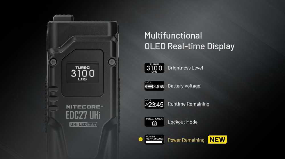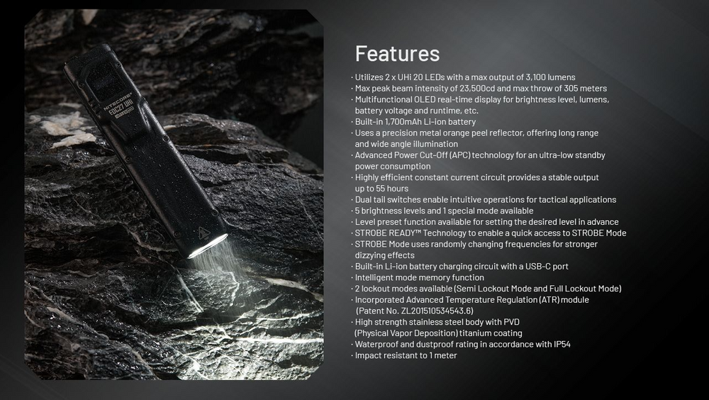 La Nitecore EDC27 UHi è una torcia ricaricabile USB di ultima generazione, progettata per offrire prestazioni eccezionali in un formato compatto. Con una potenza massima di 3100 lumen e una distanza del fascio fino a 305 metri, questa torcia è ideale per operatori di softair, forze dell'ordine, escursionisti e professionisti della sicurezza.