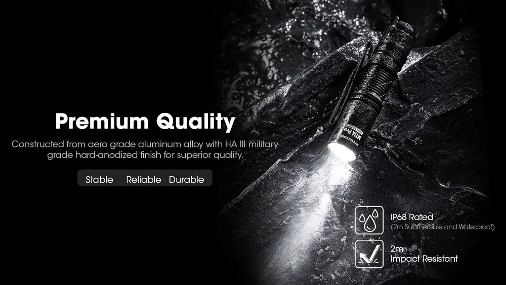 Realizzata in alluminio aeronautico, la torcia è resistente agli urti e all’acqua, perfetta per l’uso in condizioni estreme. Il design ergonomico garantisce una presa sicura anche durante movimenti rapidi.