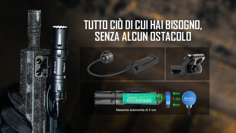 Oltre alla torcia, la confezione contiene tutto il necessario per un utilizzo professionale immediato: batteria ricaricabile, cavo di ricarica magnetico MCC3, interruttore remoto, adattatore M-LOK, viti, brugola, fascette di fissaggio e supporto RM3R. Un set completo pensato per professionisti e appassionati di softair e outdoor.
