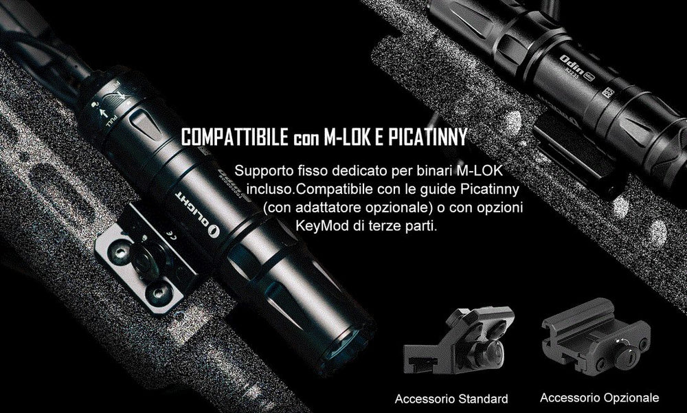 Uno dei principali punti di forza della Odin Mini è la sua compatibilità con slitte M-LOK, grazie al supporto di montaggio scorrevole incluso. Il sistema di fissaggio “ruota e blocca” garantisce un montaggio solido e sicuro, senza rischio di sganci accidentali. Inoltre, grazie alla compatibilità con i supporti della serie Odin, è possibile adattarla anche a slitte Picatinny con estrema facilità.