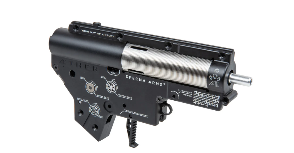 Il Gearbox AETHER™ è stato progettato per fornire la massima durata disponibile in una replica di fabbrica. Allo stesso tempo, aderisce a uno dei principi fondamentali del marchio Specna Arms: elevata compatibilità con componenti di altri produttori. Ciò lo rende una base eccellente per le custom personalizzate più esigenti e può essere utilizzato anche in altre repliche.