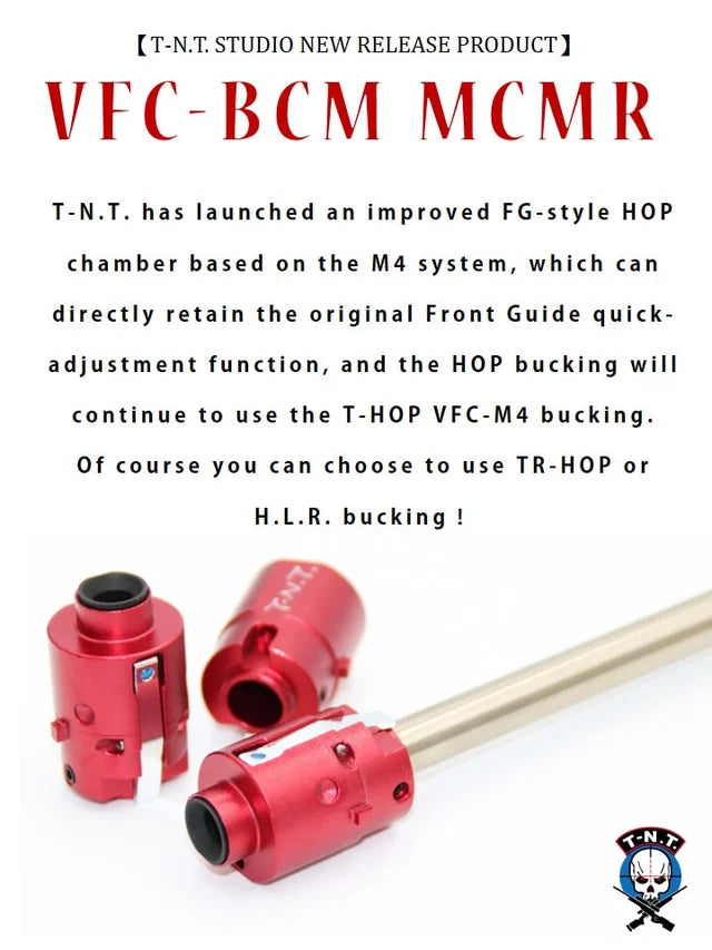 T-N.T. STUDIO has launched an improved FG-style HOP chamber based on the VFC-M4 system, retains the original front guide quick adjustment function. HOP bucking can choose T-HOP, TR-HOP or H.L.R. bucking according to the type of BB by individuals, and with S+ precision dual inner diameter eclipse air-cushion inner barrel, the shooting performance is even more better!!